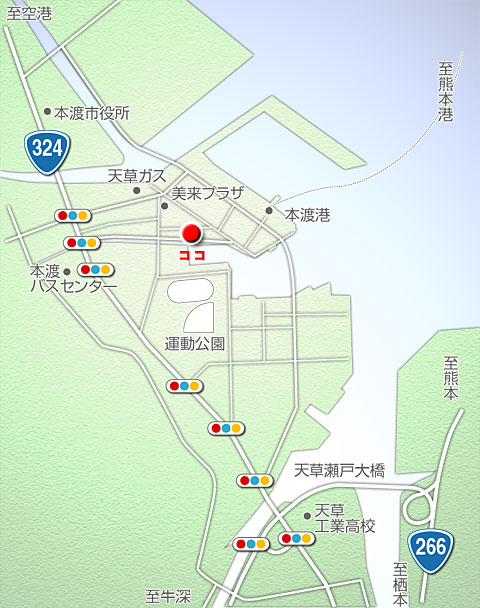 熊本市より、3号線から、宇土市へ向かい、宇土市より、57号線へ。三角から324号線へ。熊本市から、およそ90Kmほどございます。